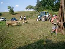 Küchenteam stellt die Bänke auf und bereitet Essen