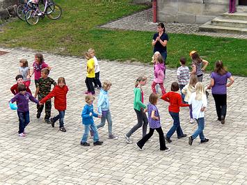 Vorbereitung der Singgruppen-Kinder am Vortag mit "Tanzlehrerin" Eva Büttner